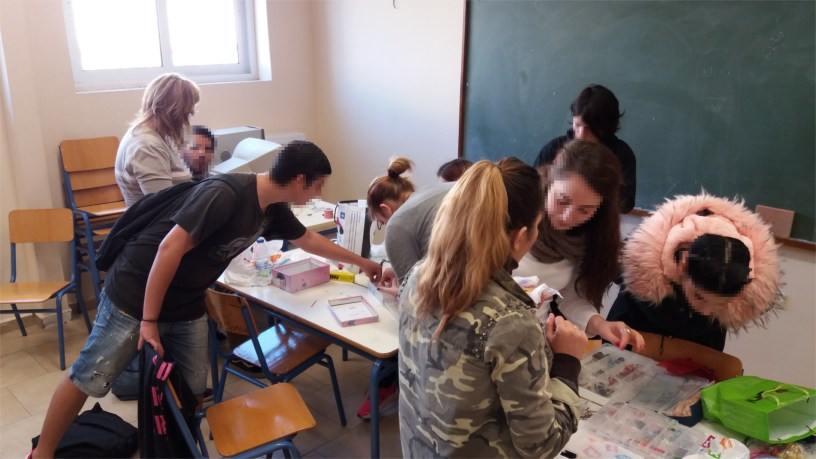 Μαθητές και μαθήτριες, κυρίως της Β’ τάξης, μαζί με τις καθηγήτριες Δέσποινα Φουντουλάκη και Κατερίνα Μπακού εργάζονται πυρετωδώς με διάθεση και κέφι προετοιμάζοντας το παζάρι του Σχολείου μας.