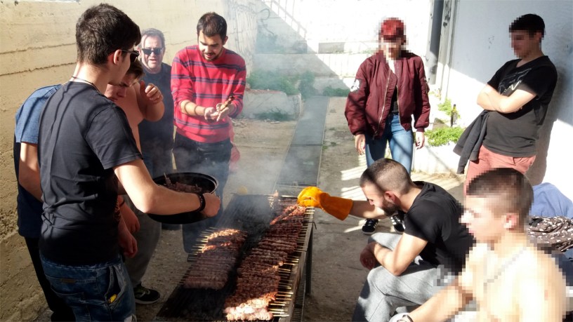 Συγκεντρωθήκαμε στο στέγαστρο του κυλικείου όπου οι ψήστες μοίρασαν σε όλους τις μερίδες τους. Το κρέας άφθονο, νοστιμότατο, καλοψημένο και για όλα τα «γούστα»: χοιρινό ή κοτόπουλο. Κανείς δεν είχε δηλώσει χορτοφάγος ή κάτι άλλο! Σιγά-σιγά το κέφι ανέβηκε –βοήθησαν σε αυτό και οι dj μας– και η σύντομη γιορτή έκλεισε με παραδοσιακούς χορούς…