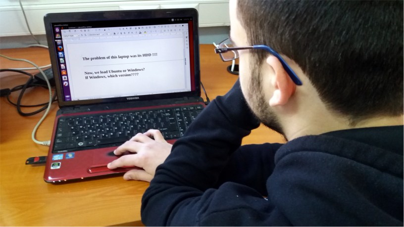 Αγοράσαμε καινούργιο HDD και στο επόμενο μάθημα στις 8 Φεβρουαρίου τον τοποθετήσαμε στον υπολογιστή. Το επόμενο που είχαμε να κάνουμε ήταν να φορτώσουμε στον καινούργιο δίσκο κάποιο λειτουργικό σύστημα. Ο οδηγός DVD του υπολογιστή ήταν χαλασμένος και έπρεπε να φορτώσουμε λειτουργικό από στικάκι USB. Το μόνο πρόσφορο λειτουργικό που είχαμε σε στικάκι ήταν το Ubuntu! Το βάλαμε σε μια θύρα USB, ανοίξαμε τον υπολογιστή και «ως δια μαγείας»… άρχισε το Ubuntu να φορτώνεται στον καινούργιο HDD!
