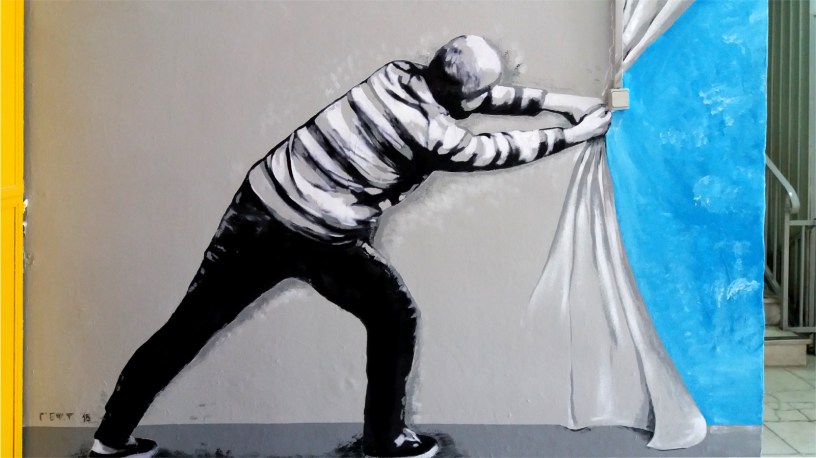 Παρασκευή 23 Φεβρουαρίου, το έργο που είναι εμπνευσμένο από το γκράφιτι του Martin Whatson “Behind the curtain” έχει ολοκληρωθεί.