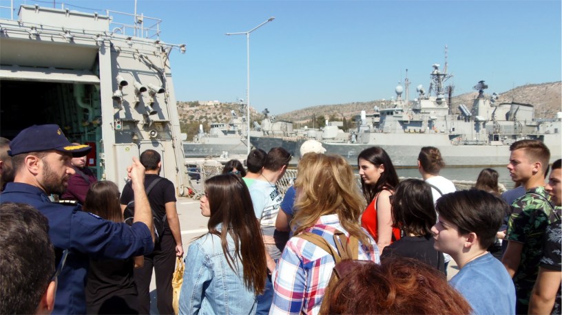 Ο Ύπαρχος, οι αξιωματικοί, οι υπαξιωματικοί και οι ναύτες της φρεγάτας μας επιφύλαξαν θερμότατη υποδοχή. Ζήσαμε με τους μαθητές μας μια εξαιρετική εμπειρία! Μας κέρασαν χυμούς, περιηγηθήκαμε στο πλοίο, ανεβήκαμε στη γέφυρα και πληροφορηθήκαμε για τις δυσκολίες, τις χαρές και τις προοπτικές που προσφέρει η υπηρεσία στο Πολεμικό Ναυτικό.