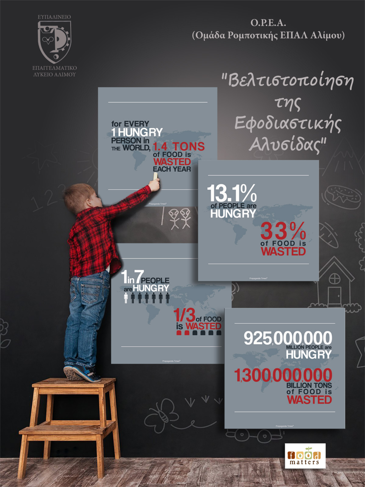 Η δική μας ιδέα είναι η αναδιανομή των τροφών από τα σημεία που περισσεύει στα σημεία που υπάρχει έλλειμμα. Στόχος η ευαισθητοποίηση όλων μας σε ένα σημαντικό παγκόσμιο πρόβλημα. Ο διαγωνισμός μας δίνει την ευκαιρία!