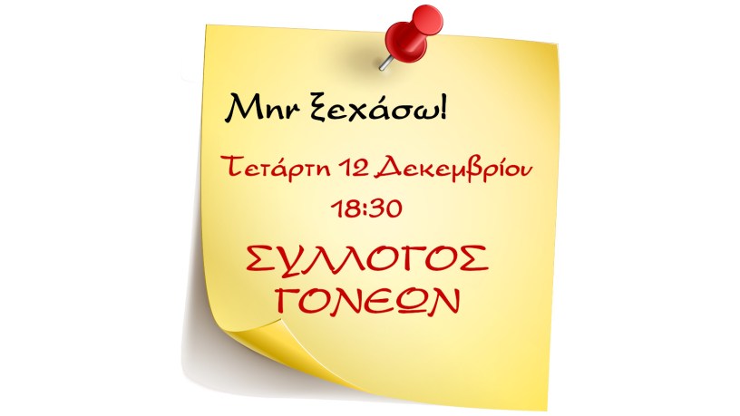 Το Διοικητικό Συμβούλιο του Συλλόγου Γονέων σας προσκαλεί στην εκλογοαπολογιστική συνέλευση που θα γίνει την Τετάρτη 12 Δεκέμβρη και ώρα 18:30 στην αίθουσα εκδηλώσεων του σχολείου μας με θέματα: