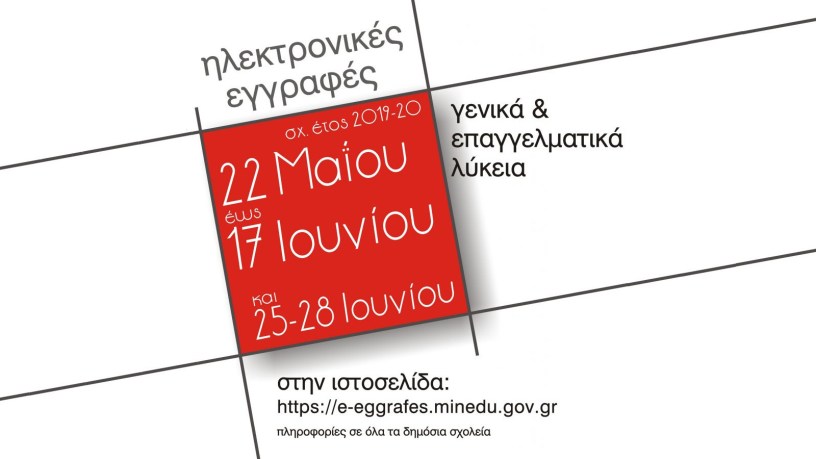 Οι μαθητές και οι μαθήτριες που επιθυμούν να εγγραφούν, ή να ανανεώσουν την εγγραφή τους ή να μετεγγραφούν σε οποιαδήποτε τάξη ΓΕΛ ή ΕΠΑΛ για το σχολικό έτος 2019 – 2020, πρέπει υποβάλλουν «Ηλεκτρονική Αίτηση εγγραφής, ανανέωσης εγγραφής ή μετεγγραφής», μέσω της εφαρμογής e-eggrafes (https://e-eggrafes.minedu.gov.gr), συμπληρώνοντας όλα τα απαραίτητα στοιχεία, από την 22η Μαΐου και ώρα 10:00 έως τη 17η Ιουνίου 2019 και ώρα 00:00.