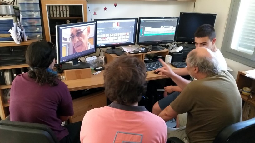 Καταμεσής του καλοκαιριού, την Τετάρτη 24 Ιουλίου 2019, συναντηθήκαμε όσοι και όσες από τα μέλη της ομάδας Ντοκιμαντέρ βρισκόμασταν ακόμα στην Αθήνα για να ολοκληρώσουμε το μοντάζ. Ο Γιάννης, η Κωνσταντίνα και ο Χάρης μαζί με τον καθηγητή τους κ. Δημήτρη Φρυδά.