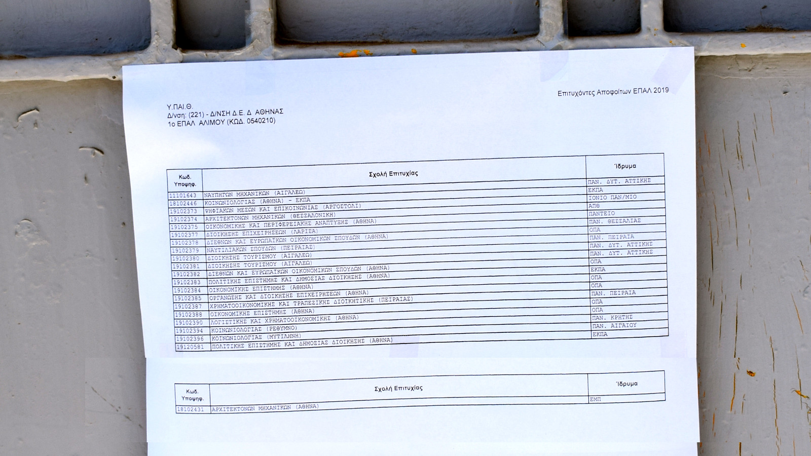 Δύο (2) μαθήτριές μας εισήχθησαν σε Αρχιτεκτονικές Σχολές (ΕΜΠ η μία και ΑΠΘ η άλλη), τρεις (3) μαθητές εισήχθησαν σε σχολές του ΕΚΠΑ, έξι (6) μαθητές σε σχολές του ΟΠΑ, δύο (2) μαθήτριες σε σχολές του ΠΑΠΕΙ, μία (1) στο Πάντειο, τρεις (3) μαθητές στο Πανεπιστήμιο Δυτικής Αττικής και από ένας ή μία στα Πανεπιστήμια Αιγαίου, Κρήτης, Θεσσαλίας και Ιόνιο.