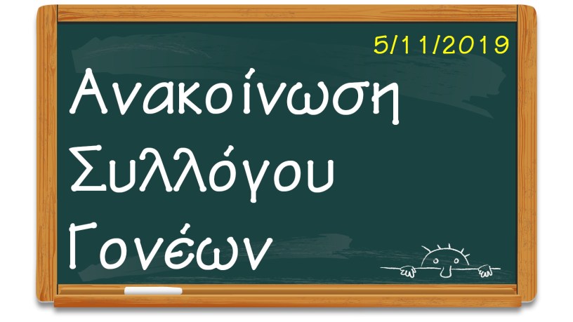 Σας ενημερώνουμε ότι το Δ.Σ. του Συλλόγου Γονέων θα συνεδριάσει την Τρίτη 5 Νοεμβρίου 2019, στις 5:30 μ.μ., στην αίθουσα του Συλλόγου Διδασκόντων με θέματα Ημερήσιας Διάταξης: