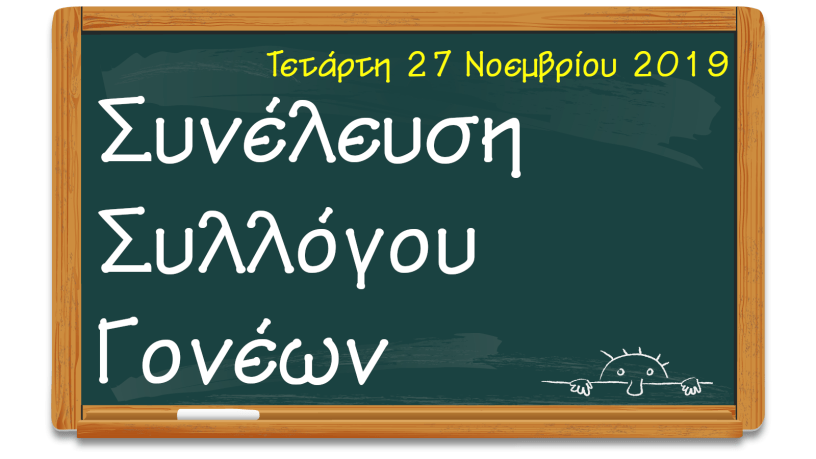 σας καλούμε στην τακτική ετήσια Γενική Συνέλευση του Συλλόγου (δεύτερη επαναληπτική) που θα πραγματοποιηθεί την Τετάρτη 27 Νοεμβρίου 2019, στις 5:30 μ.μ., στην Αίθουσα Εκδηλώσεων του Σχολείου.