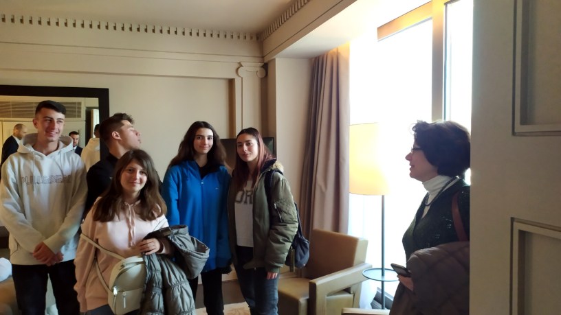Στη συνέχεια, πήραμε την πρωτοβουλία και συνοδέψαμε τους μαθητές στην αίθουσα υποδοχής του ξενοδοχείου Μεγάλη Βρετανία. Υποσχεθήκαμε ότι θα προσπαθήσουμε να προγραμματίσουμε μια διδακτική επίσκεψη και στο συγκεκριμένο ξενοδοχείο το οποίο αποτελεί ιστορικό ξενοδοχείο της πόλης μας.