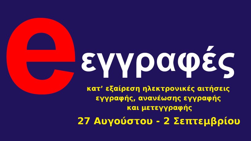 Σύμφωνα με την εγκύκλιο 109589/Δ2/25-8-2020 του Υπουργείου Παιδείας: η ηλεκτρονική πλατφόρμα e-εγγραφές θα είναι σε λειτουργία από την Πέμπτη 27 Αυγούστου 2020 και ώρα 09.00 έως την Τετάρτη 2 Σεπτεμβρίου 2020 και ώρα 23.59, προκειμένου να υποβληθούν κατ’ εξαίρεση ηλεκτρονικές αιτήσεις εγγραφής, ανανέωσης εγγραφής και μετεγγραφής για ΓΕΛ ή ΕΠΑΛ από τους γονείς-κηδεμόνες των ανήλικων μαθητών/τριών ή τους/τις ίδιους/ίδιες εφόσον είναι ενήλικοι/ες, σύμφωνα με την με αρ. πρωτ. 79942/ΓΔ4/21-05-2019 Υ.Α. (Β΄ 2005).