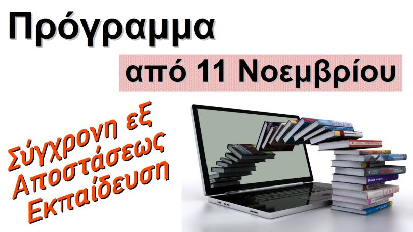 Το πρόγραμμα μαθημάτων που ισχύει από Τετάρτη 11 Νοεμβρίου 2020 και τα οποία θα γίνονται με σύγχρονη εξ αποστάσεως εκπαίδευση είναι ανά τμήμα: