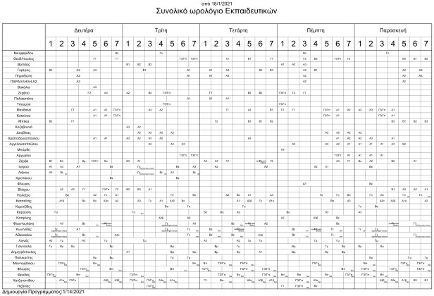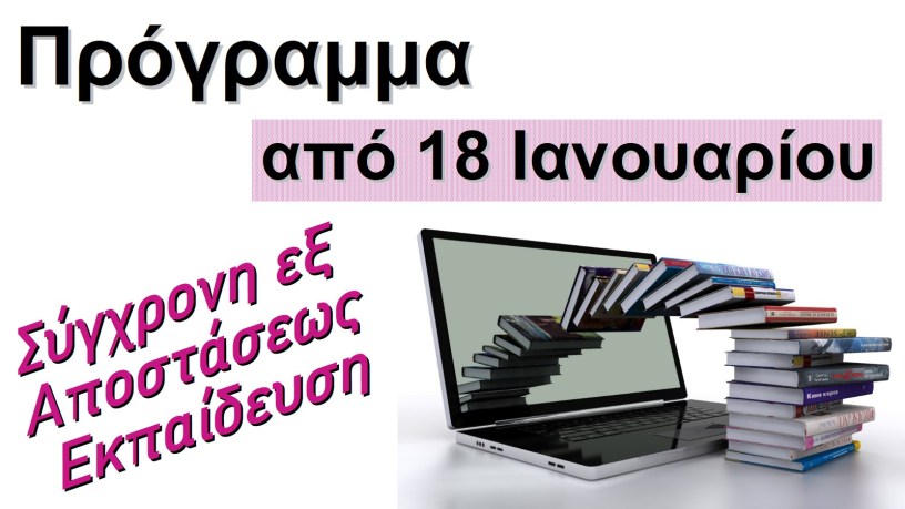Το πρόγραμμα μαθημάτων που ισχύει από Δευτέρα 18 Ιανουαρίου 2021 και τα οποία θα γίνονται με σύγχρονη εξ αποστάσεως εκπαίδευση είναι ανά τμήμα: