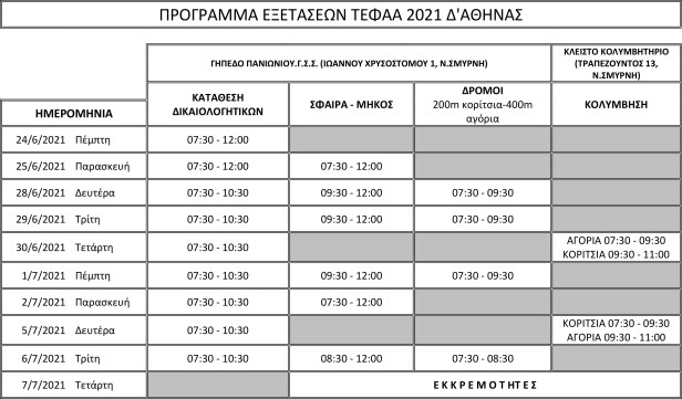 Η υγειονομική εξέταση και η πρακτική άσκηση (αγωνίσματα) θα διεξαχθούν από την Πέμπτη 24/6 μέχρι και την Τετάρτη 7/7 σύμφωνα με τον πίνακα:
