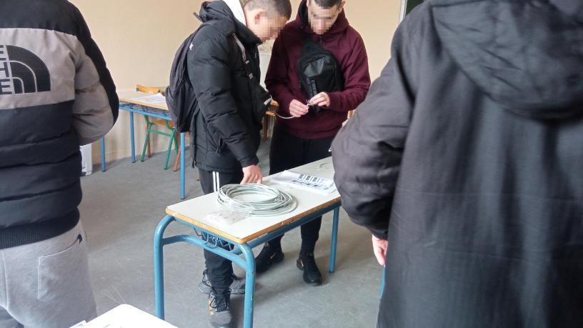 Την αρχική επίδειξη κατασκευής καλωδίου Ethernet ακολουθώντας το πρότυπο 568B, ανέλαβε μαθητής της Γ’ πληροφορικής που μετέφερε την εμπειρία του στους συμμαθητές του. Στη συνέχεια, οι μαθητές και μαθήτριες χωρίστηκαν σε ομάδες με βάση τα διαθέσιμα εργαλεία και άρχισαν να κατασκευάζουν, ο καθένας το δικό του καλώδιο. Στην πορεία βοήθησαν ο ένας τον άλλο και αντιμετώπισαν προβλήματα και σε ορισμένες περιπτώσεις χρειάστηκε να ξεκινήσουν πάλι από την αρχή καθώς το καλώδιο τους αχρηστεύτηκε…