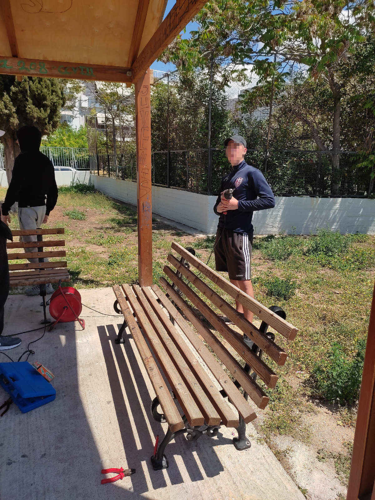 Τη Δευτέρα 24 Απριλίου στα πλαίσια του Εργαστηρίου «Τεχνολογία Μηχανολογικών Κατασκευών« οι μαθητές και μαθήτριες της Β’ τάξης Μηχανολόγων, επισκεύασαν παγκάκι της αυλής του σχολείου.