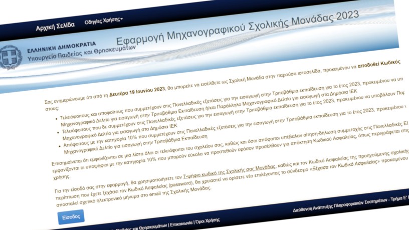 Οι διαδικασίες για την υποβολή του Μηχανογραφικού Δελτίου (ΜΔ) ΕΠΑΛ για εισαγωγή στην Τριτοβάθμια Εκπαίδευση και του και του Παράλληλου Μηχανογραφικού Δελτίου (ΠΜΔ) για εισαγωγή σε Δημόσια ΙΕΚ αρχίζουν από σήμερα (19/6/2023) και θα λήξουν περί τα μέσα Ιουλίου 2023. Οι ενδιαφερόμενοι θα πρέπει να προσέλθουν στο Λύκειό τους, για να αποκτήσουν προσωπικό κωδικό ασφαλείας (password), από τη Δευτέρα 19 Ιουνίου ως και την Παρασκευή 30 Ιουνίου 2023.