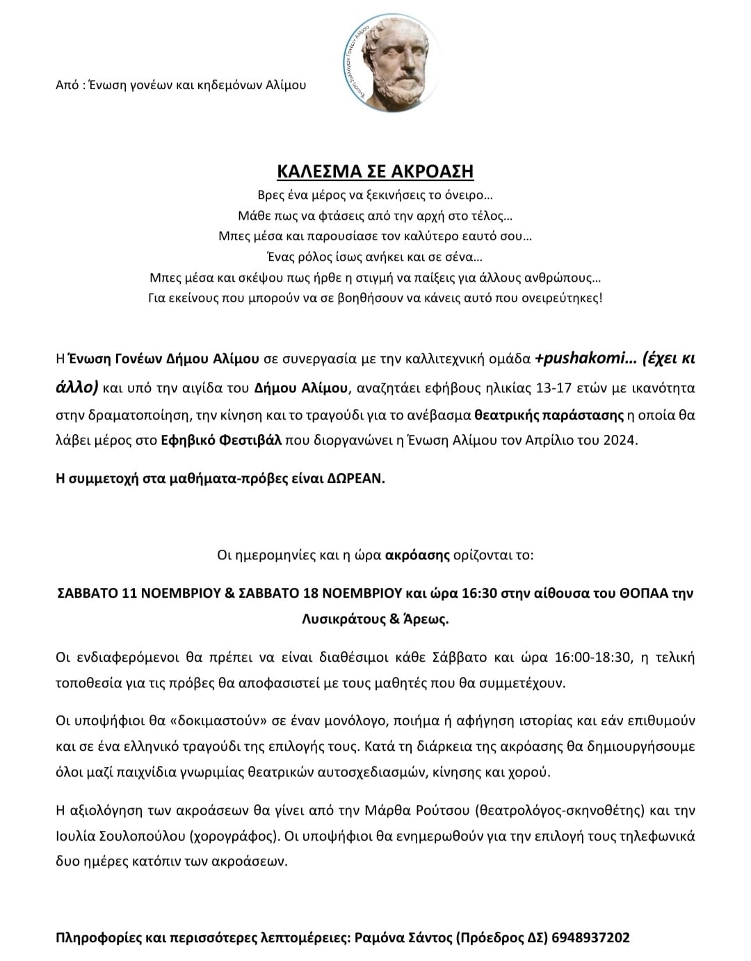 Η Ένωση Γονέων Δήμου Αλίμου σε συνεργασία με την καλλιτεχνική ομάδα +pushakomi… (έχει κι άλλο) και υπό την αιγίδα του Δήμου Αλίμου, αναζητάει εφήβους ηλικίας 13-17 ετών με ικανότητα στην δραματοποίηση, την κίνηση και το τραγούδι για το ανέβασμα θεατρικής παράστασης η οποία θα λάβει μέρος στο Εφηβικό Φεστιβάλ που διοργανώνει η Ένωση Αλίμου τον Απρίλιο του 2024. Η συμμετοχή στα μαθήματα-πρόβες είναι ΔΩΡΕΑΝ.