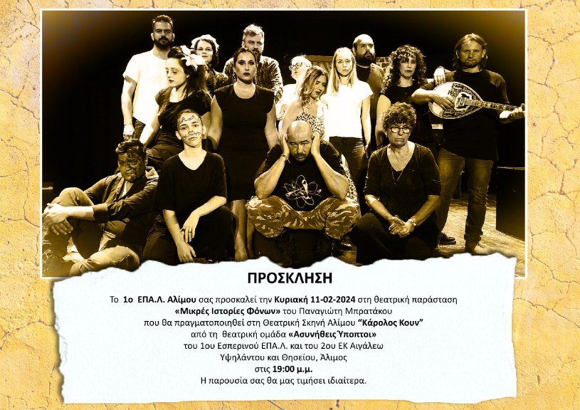 Η θεατρκή ομάδα «Ασυνήθεις Ύποπτοι», ομάδα εκπαιδευτικών από το 1ο ΕΠΑΛ και το 2ο ΕΚ Αιγάλεω, θα παρουσιάσουν το έργο του Παναγιώτη Μπρατάκου «Μικρές Ιστορίες Φόνων».