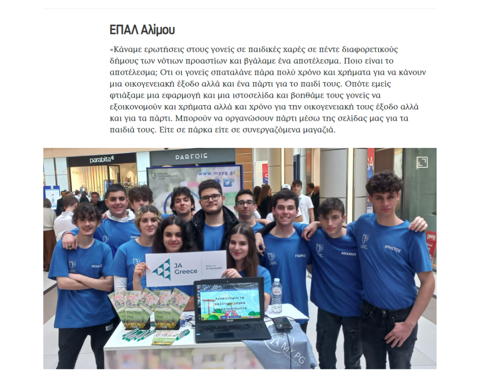 Με μεγάλη επιτυχία πραγματοποιήθηκε την Παρασκευή 16 Φεβρουαρίου η Μαθητική Εμπορική Έκθεση Αθήνας 2024 στο The Mall Athens, όπου μαθητικές ομάδες από διάφορα μέρη της Ελλάδας παρουσίασαν την Εικονική τους Επιχείρηση, στα πλαίσια του διαγωνισμού «Εικονική Επιχείρηση» της JA Achievement. Εκεί βρέθηκε και η μαθητική ομάδα του ΕΠΑΛ Αλίμου, με την δική της καινοτόμα επιχείρηση, MY PG.