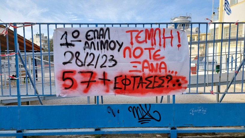 Σήμερα 28/2/2024, στο 1ο ΕΠΑΛ Αλίμου με απόφαση της Γενικής Συνέλευσης των μαθητών, μετά από εισήγηση του 15μελούς, θα πραγματοποιηθεί κατάληψη του σχολικού χώρου για την τραγωδία των Τεμπών. Πριν από ένα χρόνο σημειώθηκε στη χώρα μας ένα πρωτοφανές και απαράδεκτο δυστύχημα (έγκλημα) το οποίο συγκλόνισε την Ελληνική κοινωνία και θα μας στοιχειώνει για πολλά χρόνια. Πολλοί συμπολίτες μας, μεταξύ των οποίων άτομα νεαρής ηλικίας, έχασαν τη ζωή τους με τραγικό τρόπο σε μια εποχή που με τόση τεχνολογική ανάπτυξη, τέτοιου είδους συμβάντα είναι απαράδεκτο να συμβαίνουν. Ως μαθητές που νιώθουμε τον πόνο των γονιών για τα παιδιά που έχασαν, όπως νοιάζονται και οι δικοί μας γονείς, θεωρούμε ότι είναι δική μας υποχρέωση να στεκόμαστε δίπλα στις οικογένειες των θυμάτων και να υπάρξει δικαίωση σε όσους εμπλέκονται και είναι υπεύθυνοι γι’ αυτή την τραγωδία.