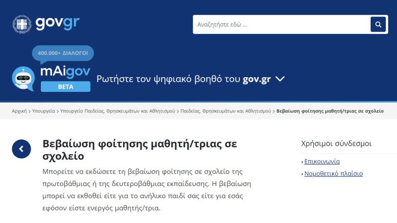 Διαθέσιμη ηλεκτρονικά μέσω του gov.gr, είναι από σήμερα η «Βεβαίωση Φοίτησης Μαθητή/τριας» σε σχολείο, ύστερα από την Κοινή Υπουργική Απόφαση των Υπουργών Παιδείας, Θρησκευμάτων και Αθλητισμού, Κυριάκου Πιερρακάκη και Ψηφιακής Διακυβέρνησης, Δημήτρη Παπαστεργίου. Οι ενδιαφερόμενοι κηδεμόνες και ενήλικοι μαθητές, μέσω μιας απλής και φιλικής διαδικασίας μπορούν να εκδώσουν ηλεκτρονικά τη βεβαίωση φοίτησης σε σχολείο της πρωτοβάθμιας ή της δευτεροβάθμιας εκπαίδευσης και να την παραλάβουν στην προσωπική τους θυρίδα πολίτη στο my.gov.gr, εύκολα και χωρίς περιττή γραφειοκρατία. Η υπηρεσία είναι προσβάσιμη είτε απευθείας στο GOV.GR, είτε στην ενότητα «Εκπαίδευση» και στην υποενότητα «Εγγραφή σε σχολείο».