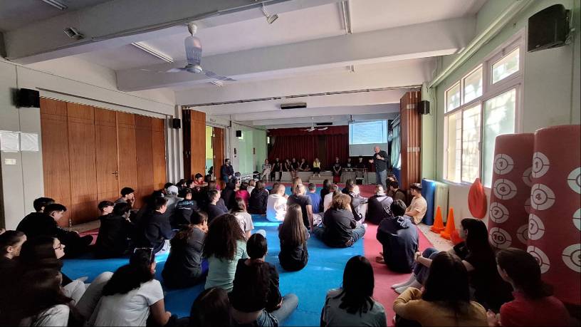 Η ενημέρωση έγινε στην αίθουσα εκδηλώσεων του σχολείου –που τις καθημερινές λειτουργεί και ως γυμναστήριο– και τα παιδιά του Γυμνασίου την παρακολούθησαν με πολύ ενδιαφέρον. Ακολούθησε ζωηρή συζήτηση, με ερωτήσεις, έξυπνες παρατηρήσεις και απορίες. Οι μαθητές του σχολείου μας Ραφαέλλα Ρεμβαλτάδου της Β’ Εφαρμοσμένων Τεχνών, Δήμητρα Μαραγκουδάκη της Β’ Διοίκησης-Οικονομίας, Νεφέλη Μάντζαρη της Γ’ Εφαρμοσμένων Τεχνών, Άγγελος Δήμος της Β’ Ναυτιλιακών Σπουδών, ο Γιάννης Μαράκης Γ’ Εφαρμοσμένων Τεχνών καθώς και οι μαθητές της Α’ τάξης Σοφία Σπανάκη, Γιάννης Φώλας και Γιάννης Πελεκάνος. Να σημειωθεί ότι κάποιοι από τους παραπάνω μαθητές και μαθήτριες όπως η Ραφαέλλα Ρεμβαλτάδου και ο Γιάννης Πελεκάνος είναι απόφοιτοι του 5ου Γυμνάσιου!