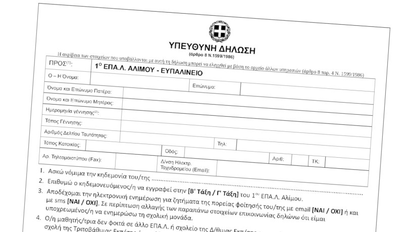 Για να ολοκληρωθεί η εγγραφή μαθητή ή μαθήτριας που φοιτούσε τη σχολική χρονιά 2023-24 στο ΕΠΑΛ Αλίμου, εκτός από την e-εγγραφή, πρέπει να υποβληθεί από τον “κηδεμόνα αίτησης e-Eggrafes” και υπεύθυνη δήλωση (ΥΔ). Η ΥΔ και το έντυπο της e-εγγραφής πρέπει να παραδοθεί ή να αποσταλεί με email (1epal-alimou@sch.gr) στο σχολείο.