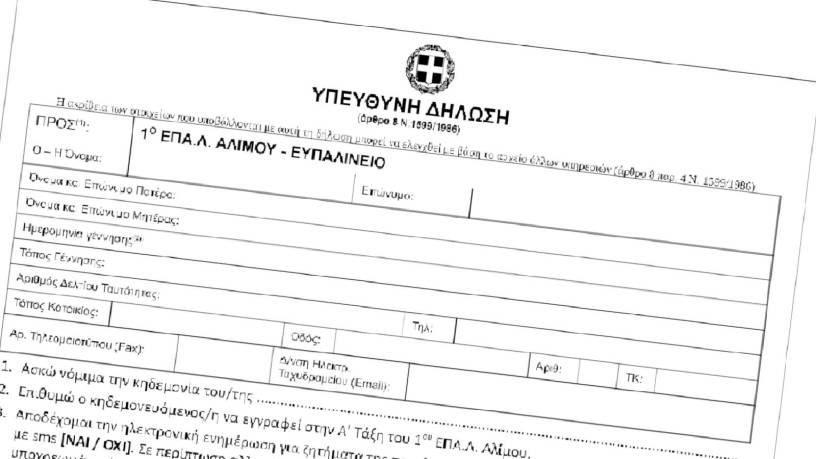 Υπεύθυνη Δήλωση για εγγραφή στην Α’ τάξη