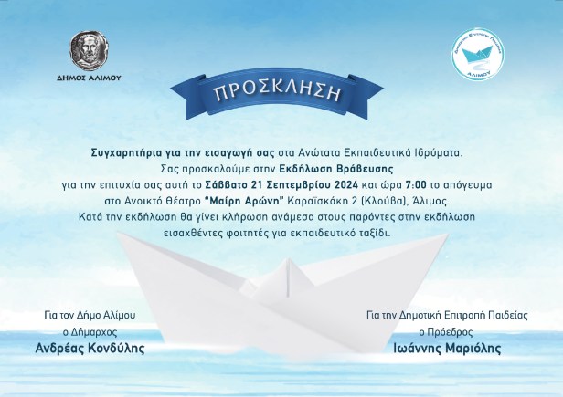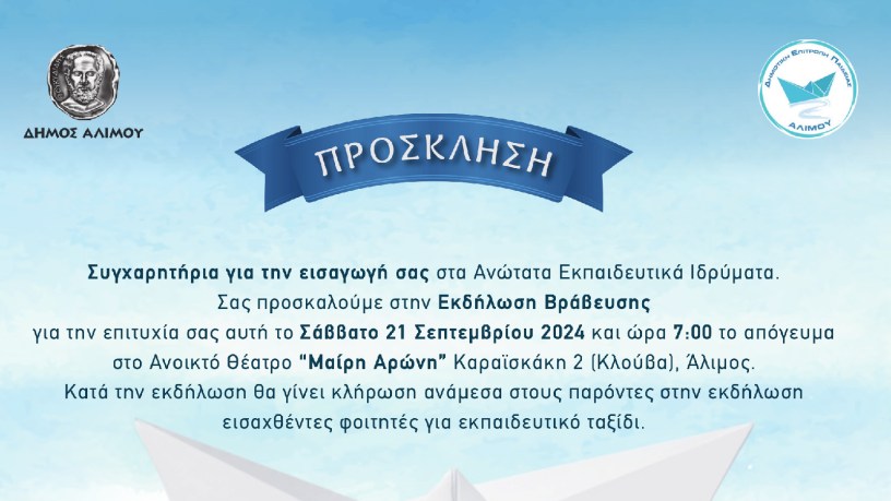Το Σάββατο 21 Σεπτεμβρίου και ώρα 7μμ ο Δήμος Αλίμου θα βραβεύσει τους επιτυχόντες στις Πανελλαδικές 2024. Η εκδήλωση θα γίνει στο θέατρο Μαίρη Αρώνη Καραϊσκάκη 2 (Κλούβα). Επίσης, θα γίνει κλήρωση ανάμεσα στους παρόντες εισαχθέντες φοιτητές/τριες για εκπαιδευτικό ταξίδι.
