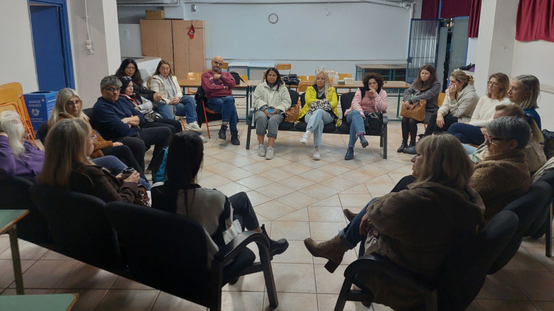 Τη Δευτέρα 2/12/2024 το απόγευμα, πραγματοποιήθηκε η πρώτη συνάντηση της ομάδας ψυχοεκπαίδευσης και υποστήριξης γονέων στο χώρο του σχολείου με διάρκεια δύο περίπου ωρών. Στην ομάδα συμμετείχαν 20 γονείς μαθητών και μαθητριών του ΕΠΑΛ Αλίμου η διευθύντρια Θεοδώρα Παπαθανασίου, η πρόεδρος του Συλλόγου Γονέων και κηδεμόνων Γεωργία Υφαντίδου, οι καθηγήτριες του σχολείου Αλεξάνδρα Ζέρβα, Ελένη Πολύζου και Κατερίνα Μπακού καθώς και η ψυχολόγος του σχολείου Μαρία Βασιλείου, η οποία είχε και την ευθύνη συντονισμού της διαδικασίας. Οι συμμετέχοντες κάθισαν γύρω από έναν κύκλο ώστε να διευκολυνθεί η ανοιχτή επικοινωνία, το ελεύθερο μοίρασμα σκέψεων και συναισθημάτων και η ισότιμη συμμετοχή.