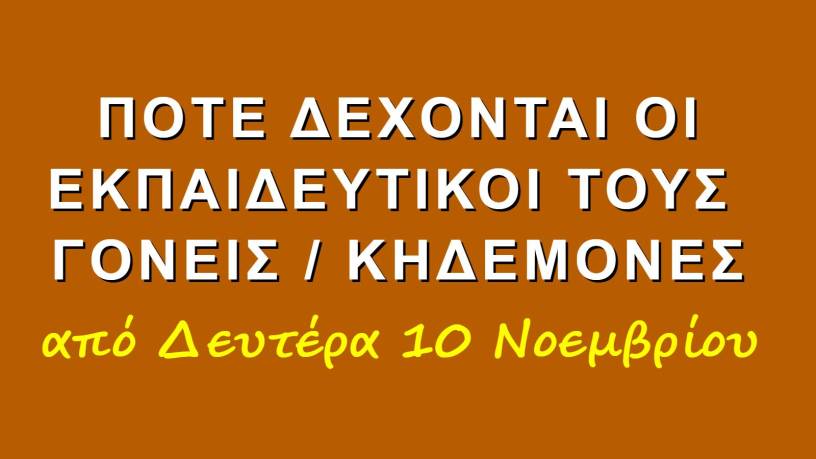 Οι ημέρες και ώρες της εβδομάδας που δέχονται οι εκπαιδευτικοί του σχολείου τους γονείς και κηδεμόνες για να συζητήσουν θέματα που αφορούν τα παιδιά μας είναι: