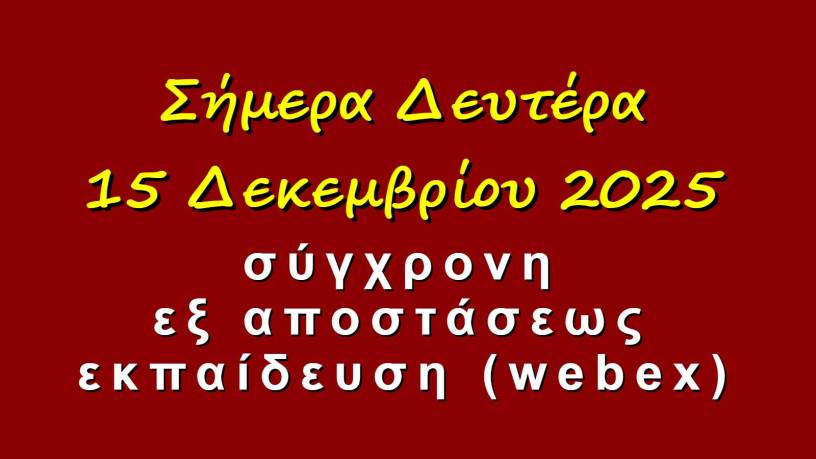 Σας ενημερώνουμε ότι σήμερα, Δευτέρα 15 Δεκεμβρίου 2025, λόγω μαθητικής κατάληψης τα μαθήματα θα γίνουν με σύγχρονη εξ αποστάσεως εκπαίδευση (webex).