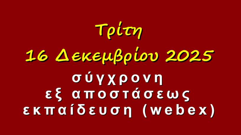 Σας ενημερώνουμε ότι την Τρίτη 16 Δεκεμβρίου 2025, λόγω μαθητικής κατάληψης τα μαθήματα θα γίνουν με σύγχρονη εξ αποστάσεως εκπαίδευση (webex).