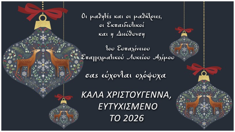 Οι μαθήτριες και οι μαθητές, οι Εκπαιδευτικοί και η Διεύθυνση του Ευπαλίνειου Επαγγελματικού Λυκείου Αλίμου σας εύχονται ολόψυχα ΚΑΛΑ ΧΡΙΣΤΟΥΓΕΝΝΑ και ΕΥΤΥΧΙΣΜΕΝΟ ΤΟ 2026
