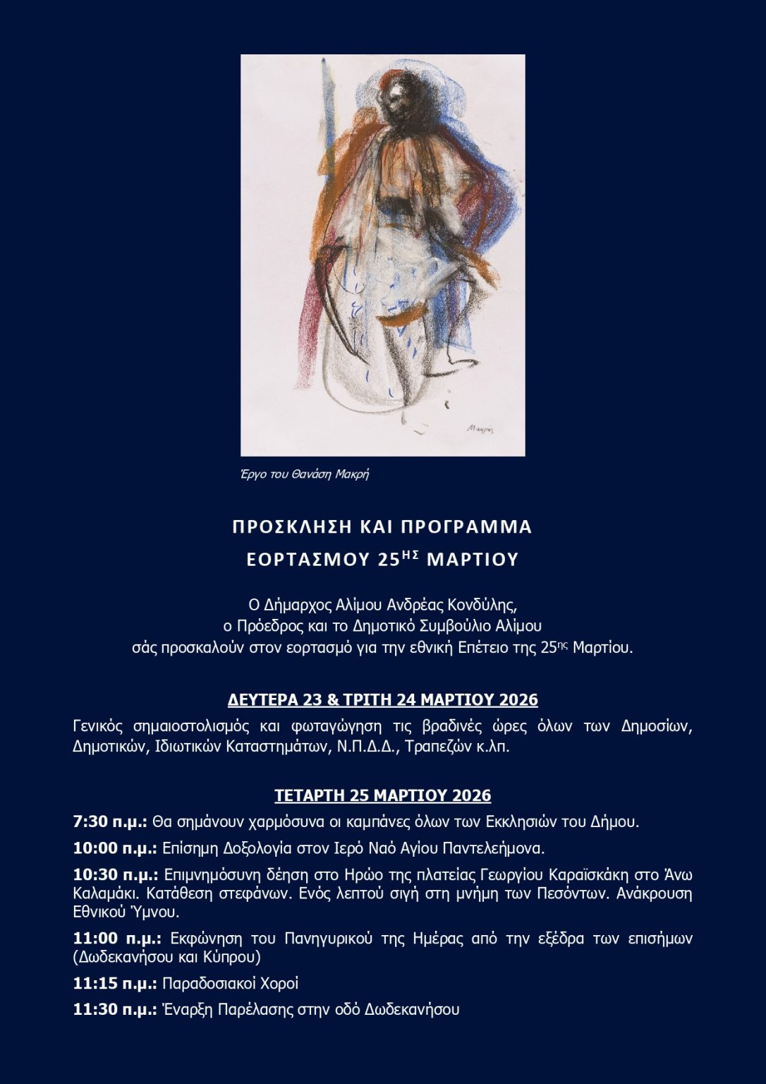 - 11:15πμ Συνάντηση μαθητών και μαθητριών που θα παρελάσουν έξω από την είσοδο του ΕΠΑΛ επί της Δωδεκανήσου. Υπεύθυνος για την παρέλαση ο κ. Ιωάννης Βογανάτσης.