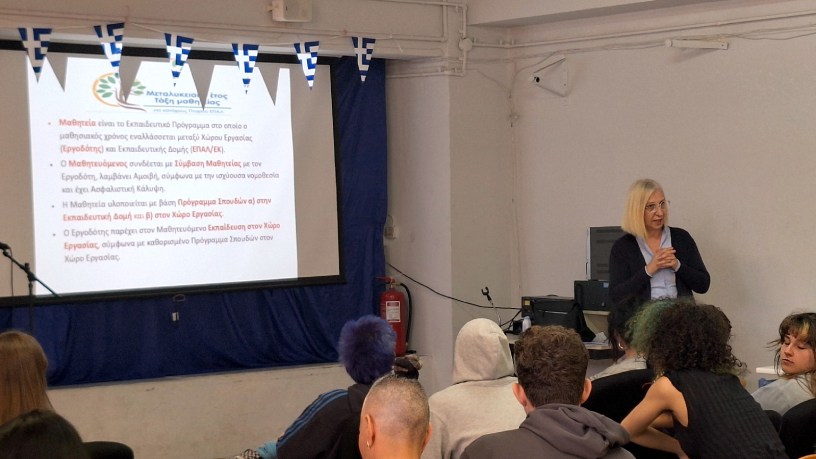 Την Πέμπτη 26 Μαρτίου 2026 πραγματοποιήθηκε στο σχολείο μας ενημέρωση προς τους μαθητές της Γ΄ τάξης σχετικά με τον θεσμό της Μαθητείας. Η ενημέρωση έγινε από την υπεύθυνη του προγράμματος, κα …………………, η οποία παρουσίασε στους μαθητές τις βασικές πληροφορίες για τις δυνατότητες που προσφέρει η Μαθητεία μετά την αποφοίτησή τους από το σχολείο.
