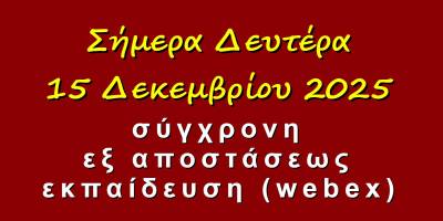 Σήμερα Δευτέρα 15/12, τα μαθήματα θα γίνουν με σύγχρονη εξ αποστάσεως εκπαίδευση (webex)